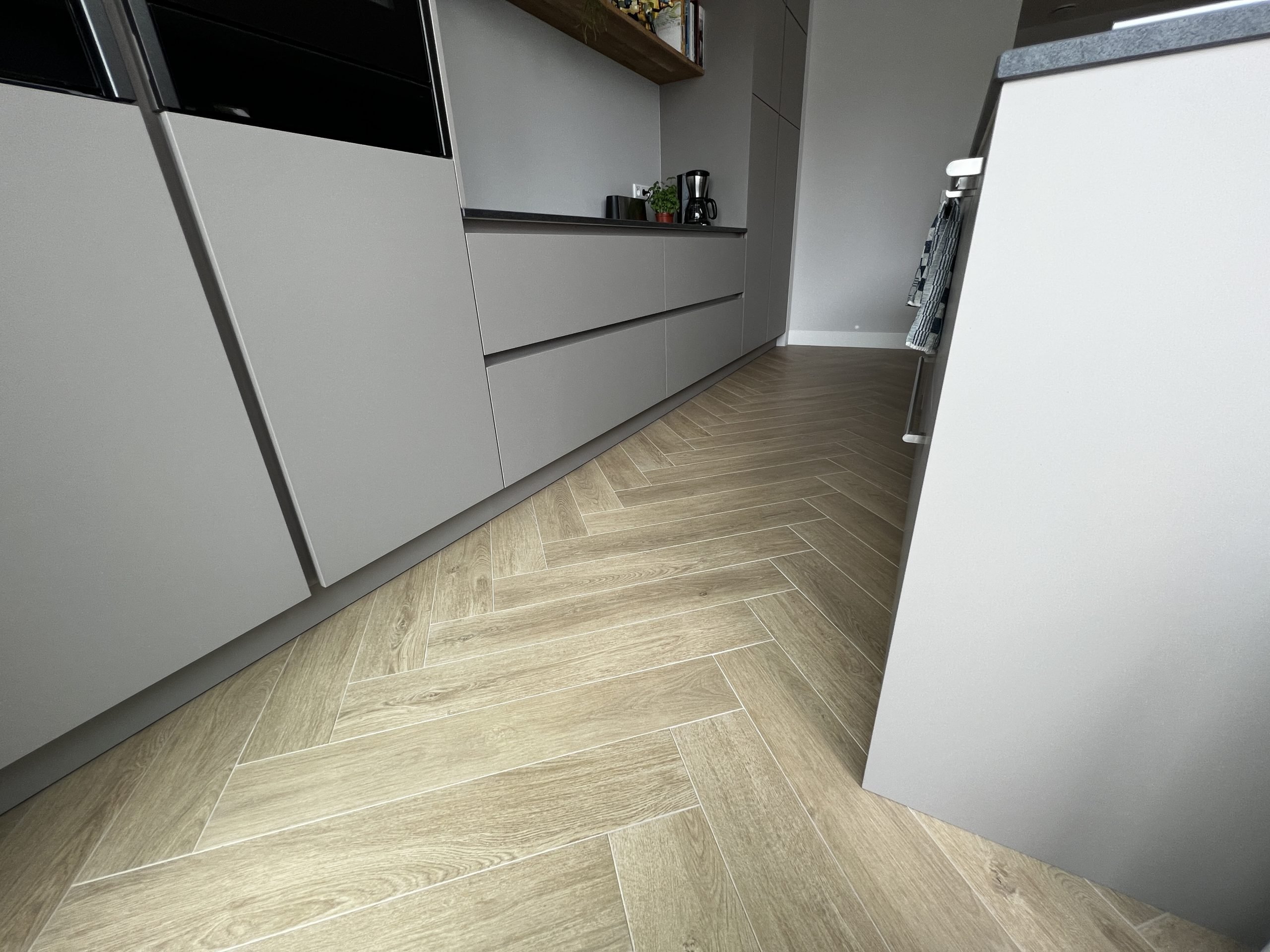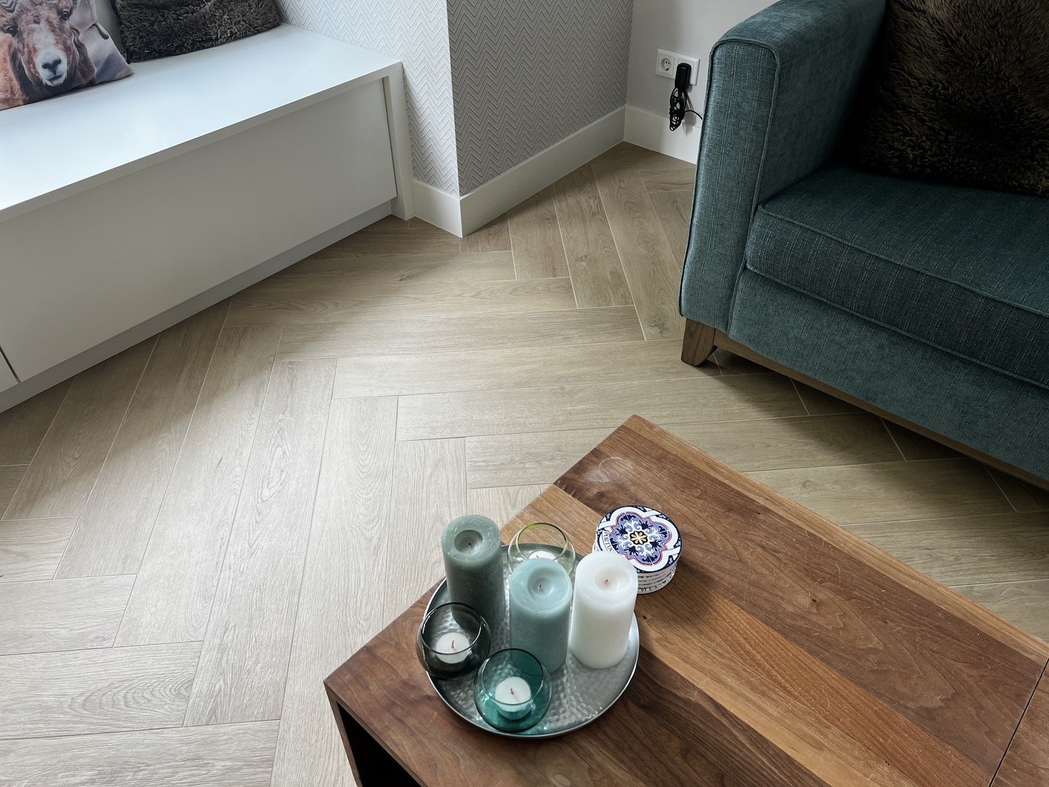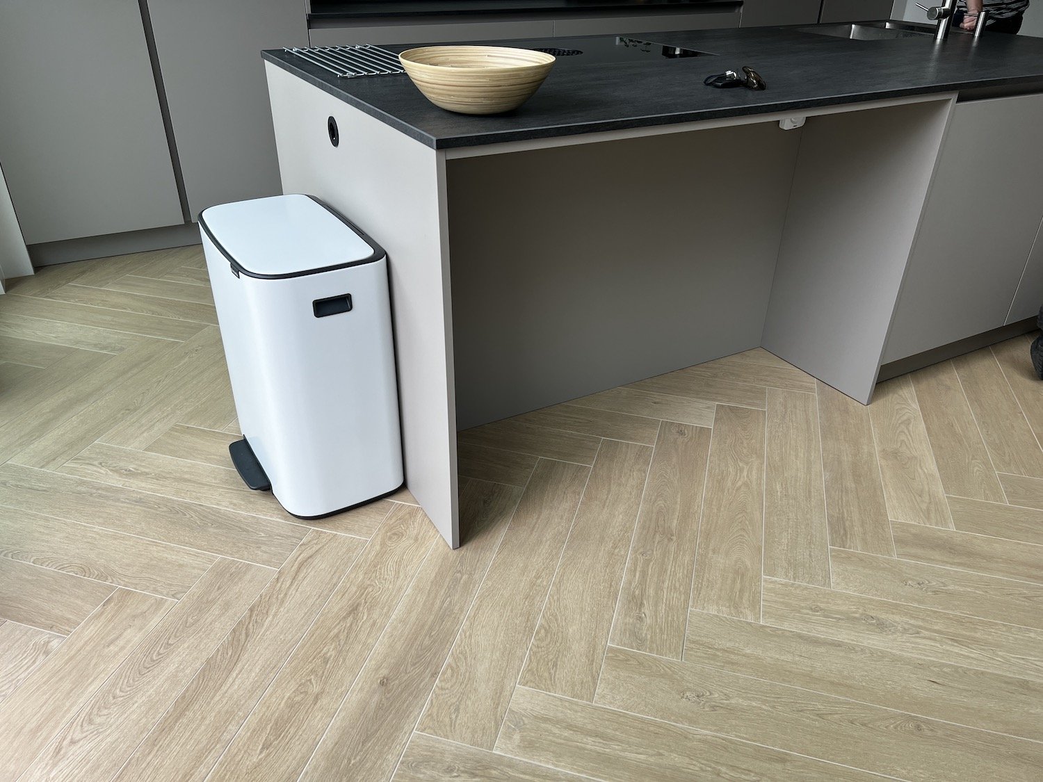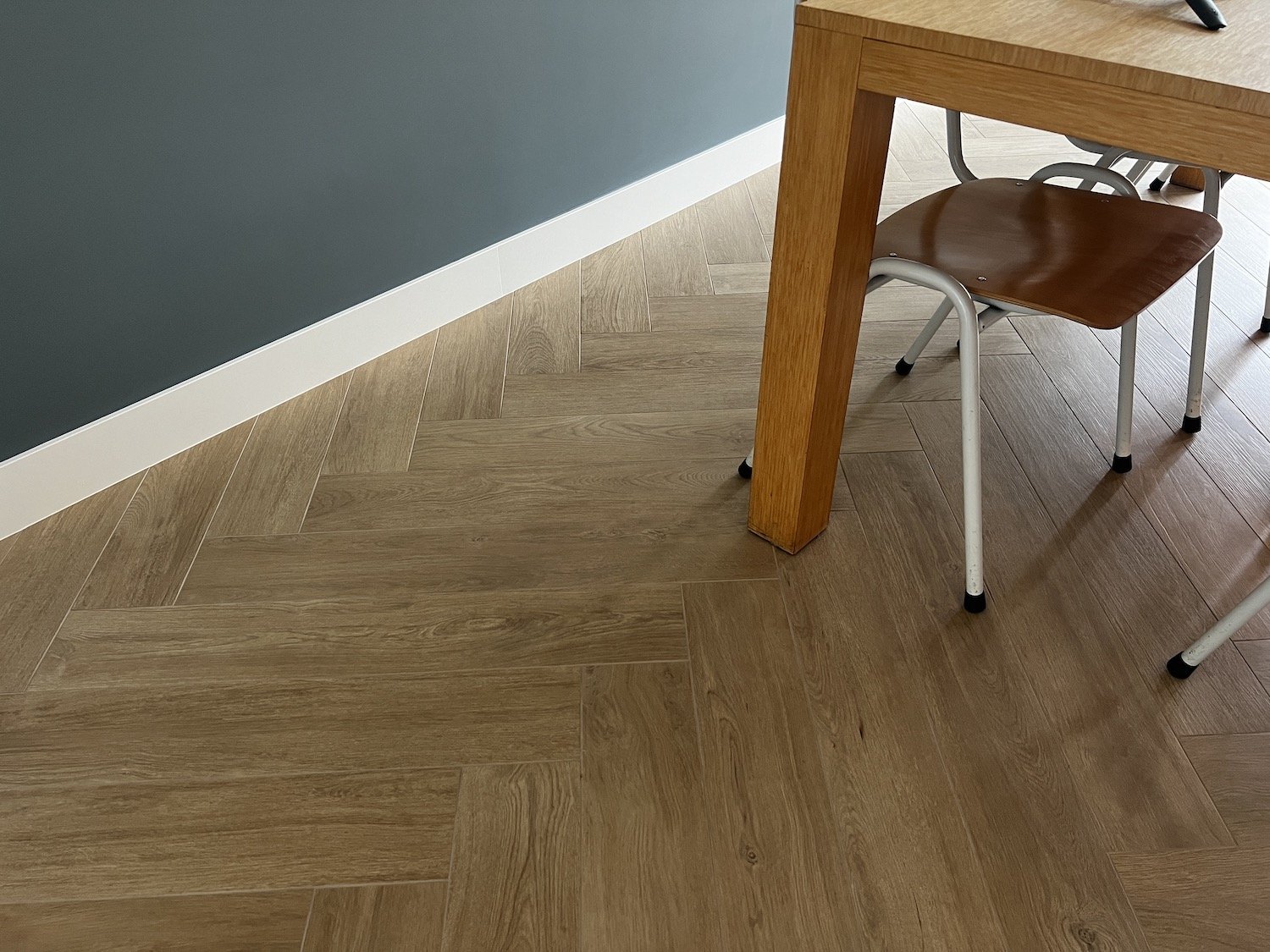 Na wat research over de verschillende opties van vloerbekleding is de keuze uiteindelijk gevallen op visgraat houtlook tegels. ‘Ik wist eerst niet eens dat zoiets bestond en na wat zoeken ben ik gestuit op keramiek’, verteld de eigenaar met een lach. Na alle voor- en nadelen van de verschillende opties naast elkaar gehouden te hebben, werd een keramische vloer een feit.
