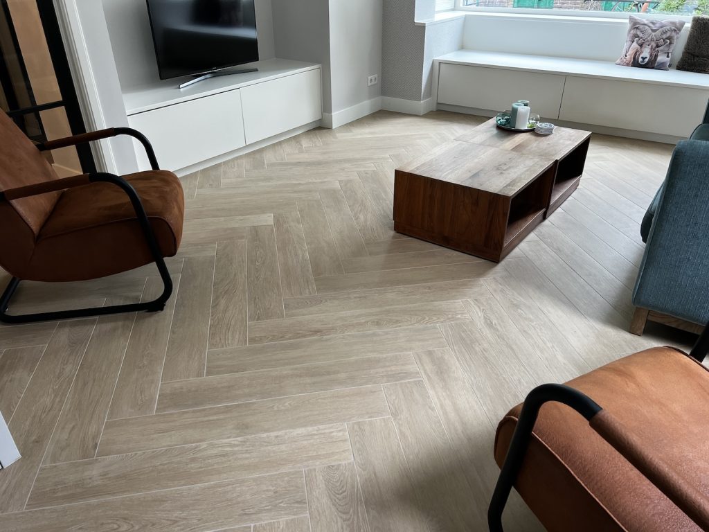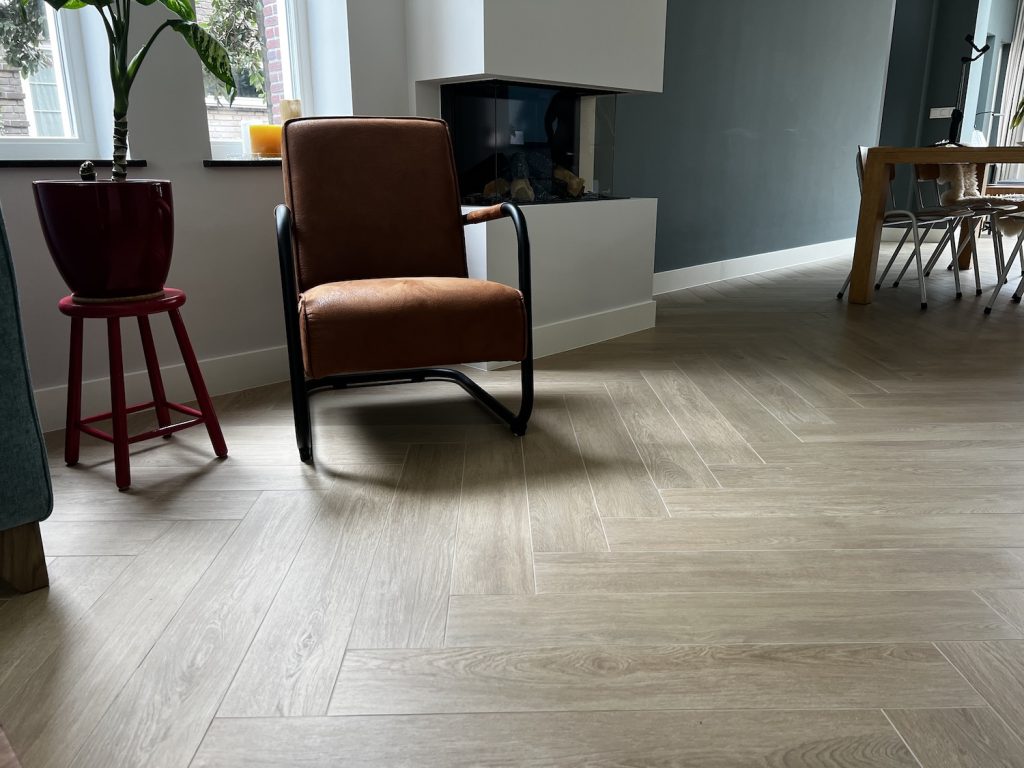 Na wat research over de verschillende opties van vloerbekleding is de keuze uiteindelijk gevallen op visgraat houtlook tegels. ‘Ik wist eerst niet eens dat zoiets bestond en na wat zoeken ben ik gestuit op keramiek’, verteld de eigenaar met een lach. Na alle voor- en nadelen van de verschillende opties naast elkaar gehouden te hebben, werd een keramische vloer een feit.
