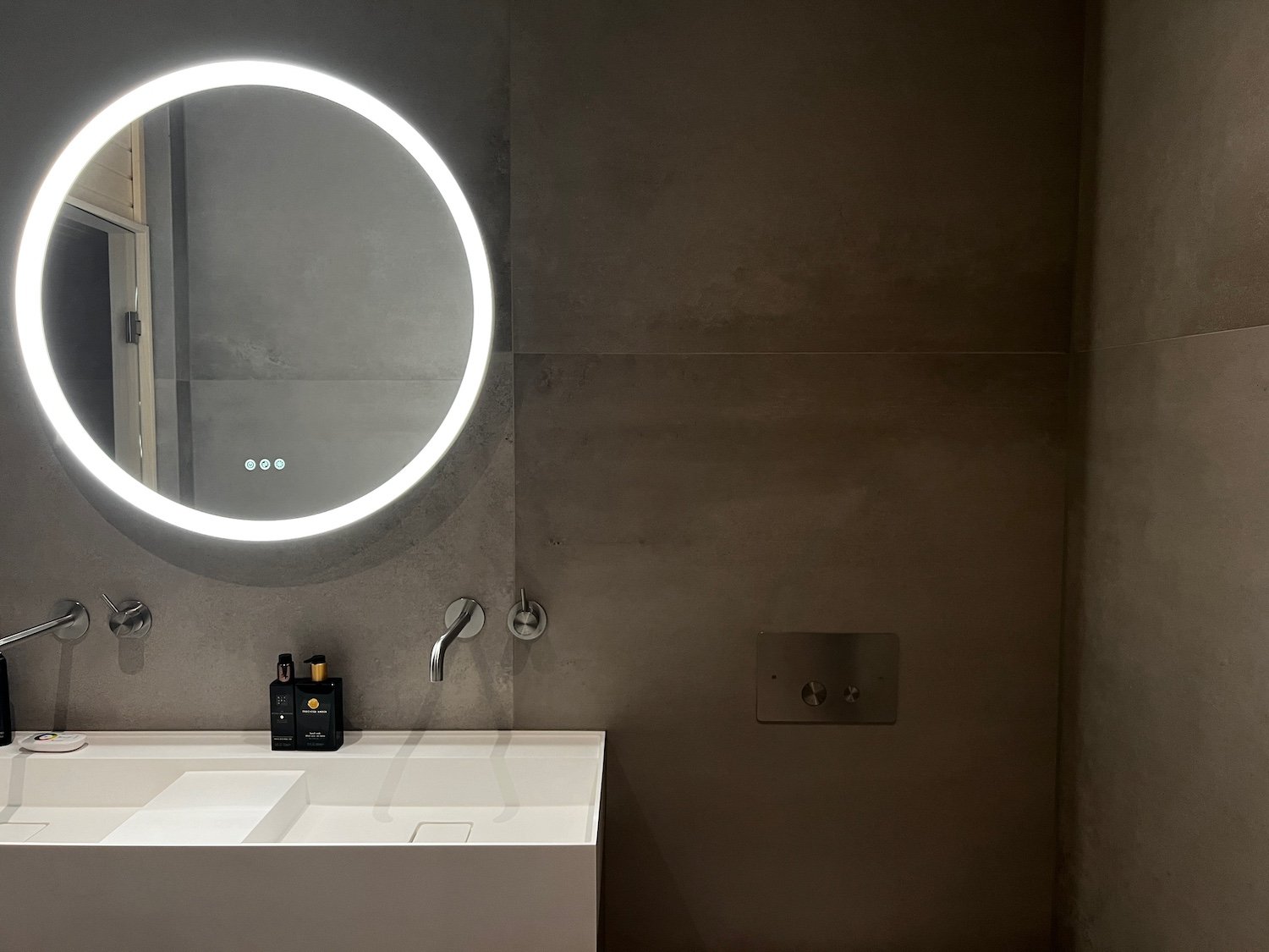 Op de begane grond verwelkomt de Flaviker Cozy Havanna tegel bezoekers met zijn uitnodigende houtlook. Deze keramische tegel, met zijn uitzonderlijk lange formaat van 2 meter, creëert een rustige en luxe sfeer in de ruimte. Het tegelzetwerk, met een minimale voegbreedte van slechts 1,5 mm, getuigt van vakmanschap en precisie, resulterend in een strak en naadloos oppervlak.