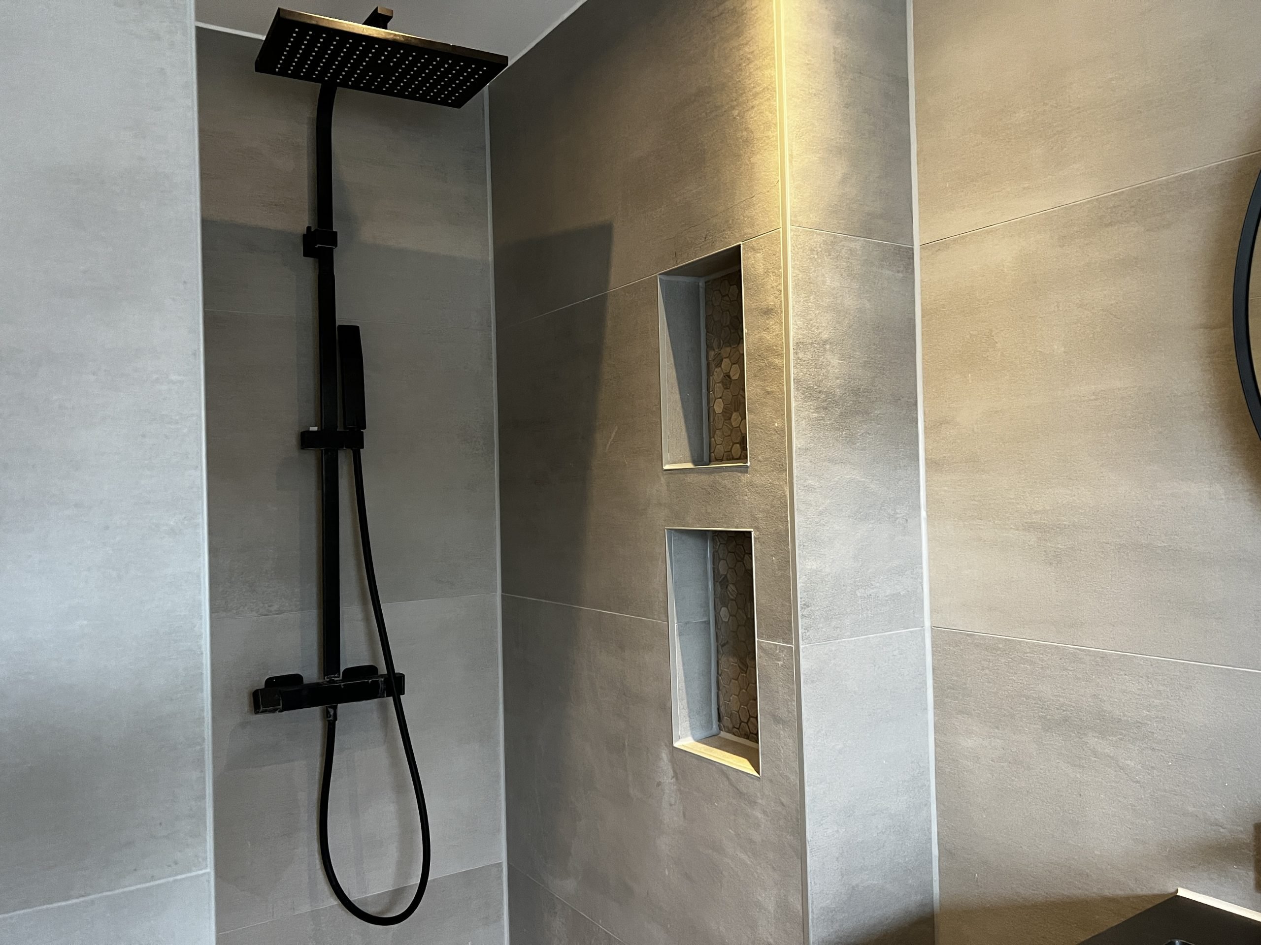 We vroegen Jeroen en Esther naar hun keuze voor de look van hun badkamer. De keuze viel gelijk op betonlook tegels en ze legden uit dat ze een zwart badkamermeubel wilden met een donkere wasbak en zwarte opbouwkranen. De douche en badkraan zijn ook zwart om eenheid in het sanitair te creëren.